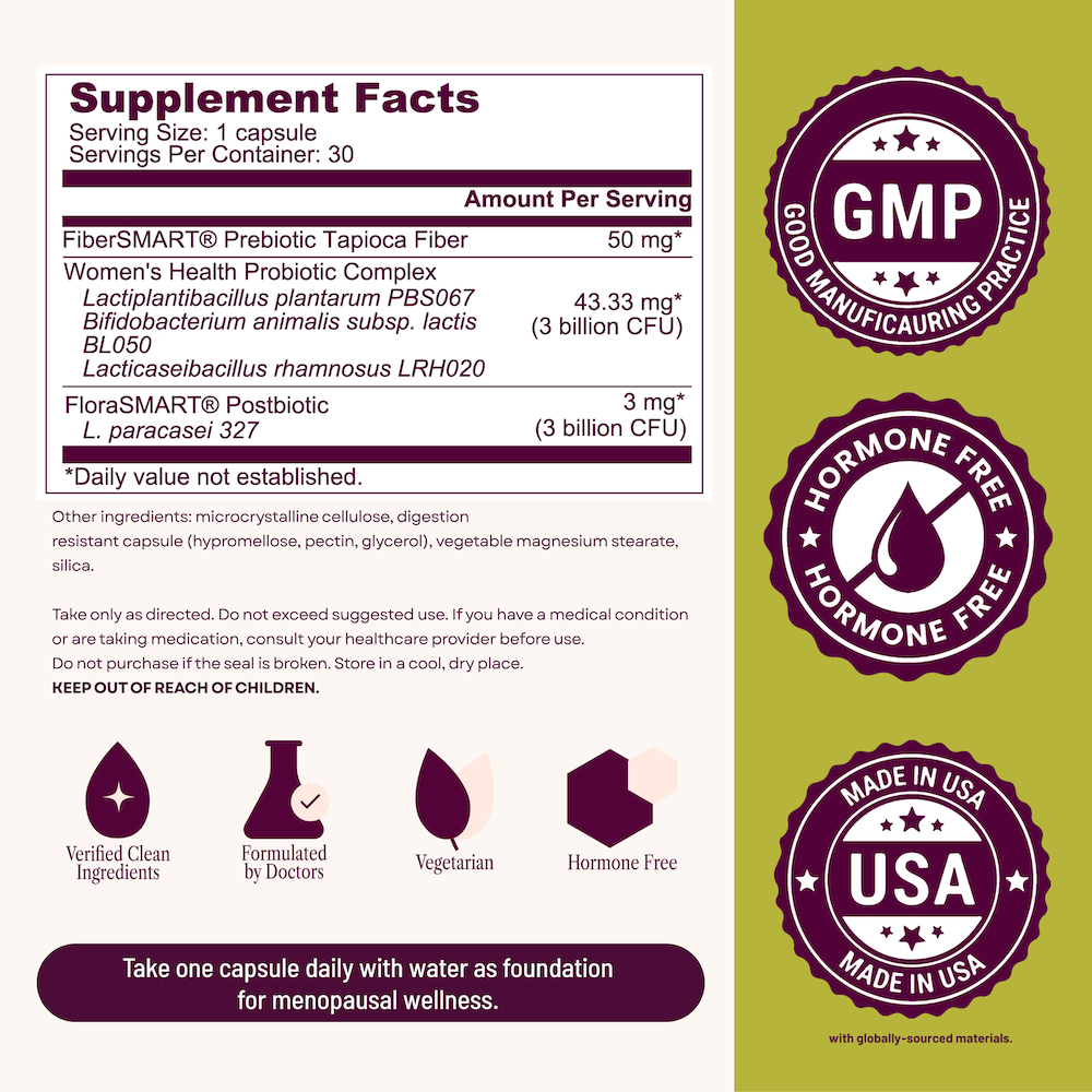 - Uses clinically studied probiotic strains selected specifically for midlife vaginal and gut changes.
