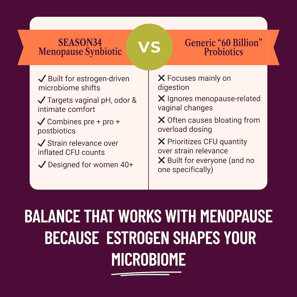 SEASON34 Menopause Microbiome Foundation is designed to address the microbiome changes that occur as estrogen levels decline — including vaginal pH disruption, odor changes, and yeast-prone imbalance, bloating, and digestive discomfort.