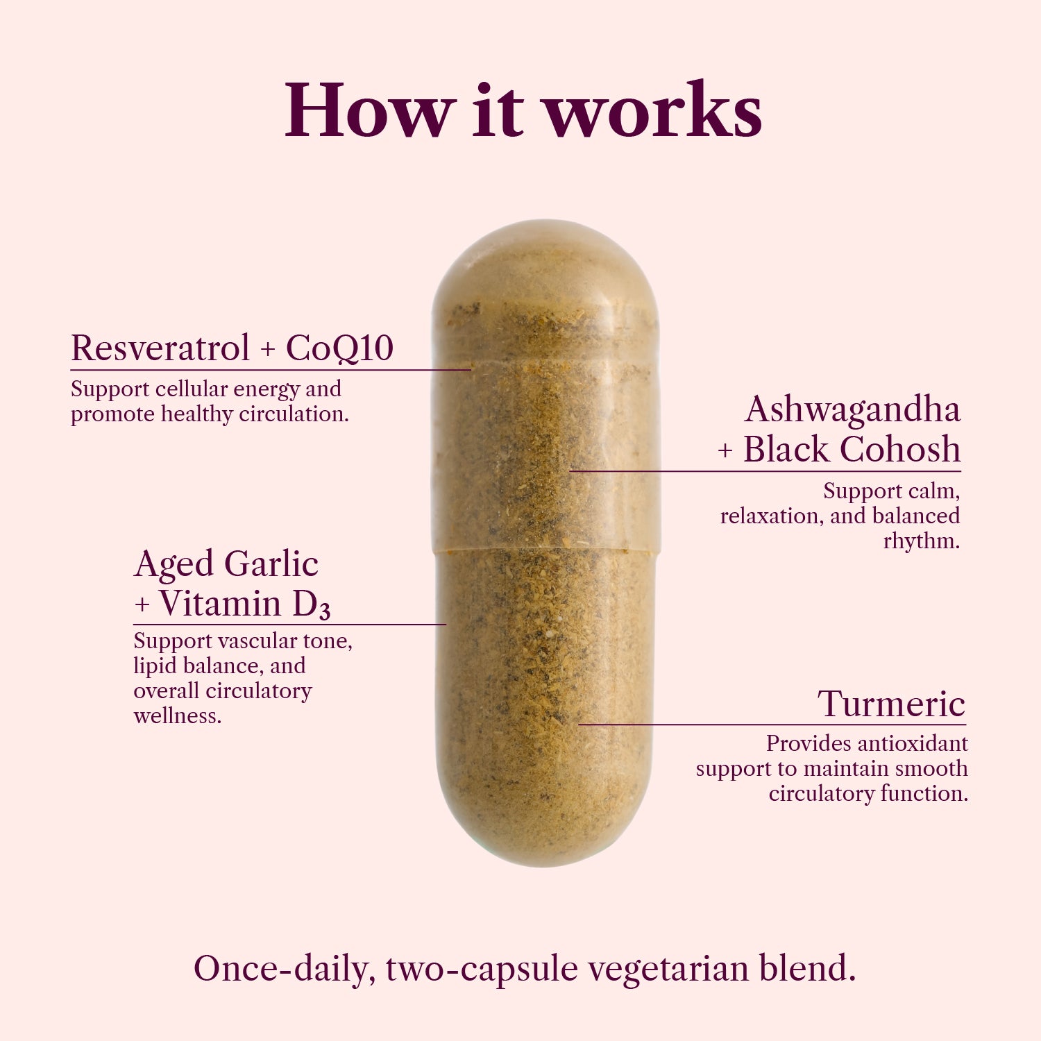 - Powered by CoQ10, fermented resveratrol, aged aged black garlic, and turmeric for comprehensive heart and flow support.