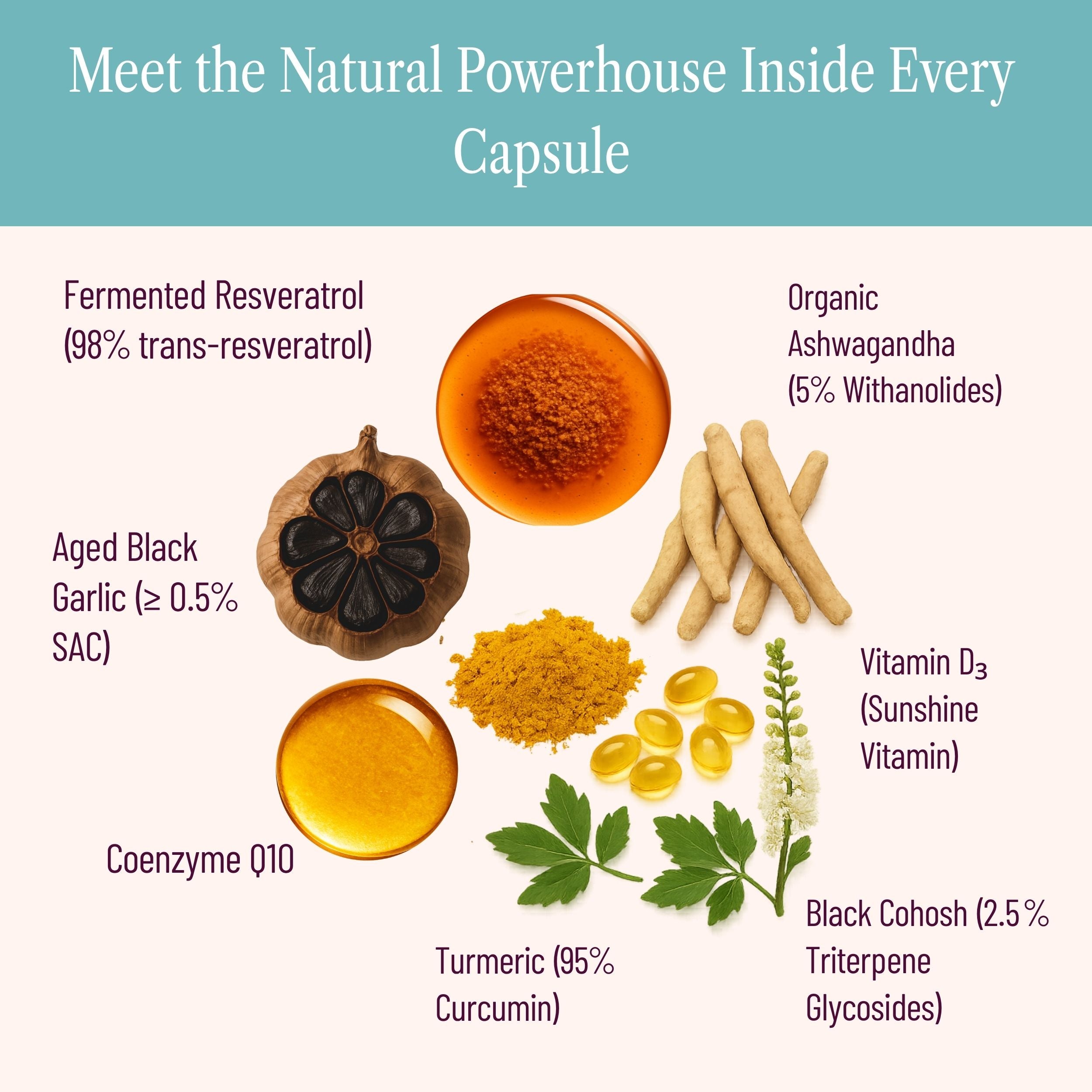 A blend of CoQ10, fermented resveratrol, aged black garlic, and turmeric, formulated to complement daily wellness routines. Created for those looking to add a balanced, nutrient-focused supplement to their lifestyle