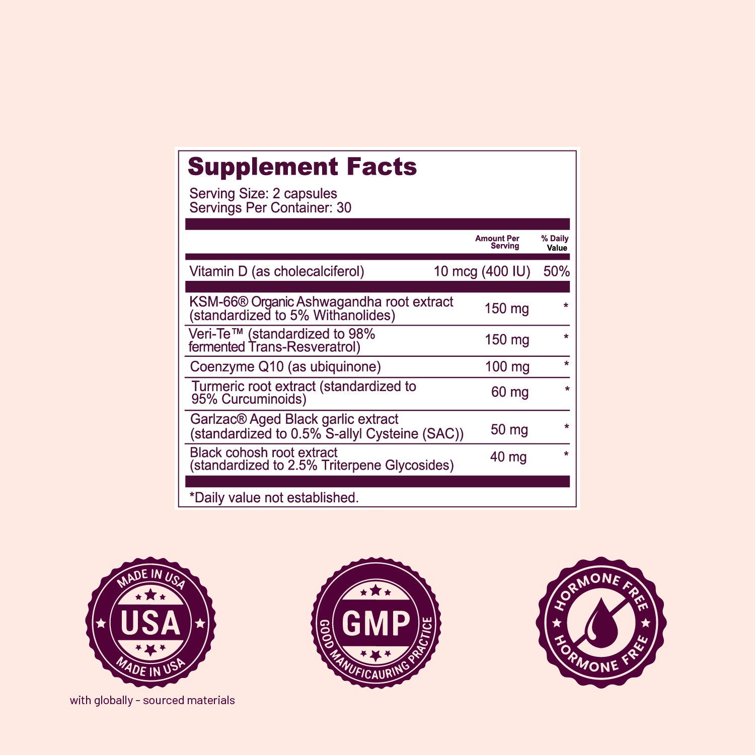 Clinically formulated to promote circulation, cellular energy, and vascular balance during menopause. This formula combines CoQ10, aged black garlic, and fermented resveratrol for energy and flow support, plus turmeric and vitamin D₃ for antioxidant protection. Designed for daily use to help you feel balanced and resilient through every stage.