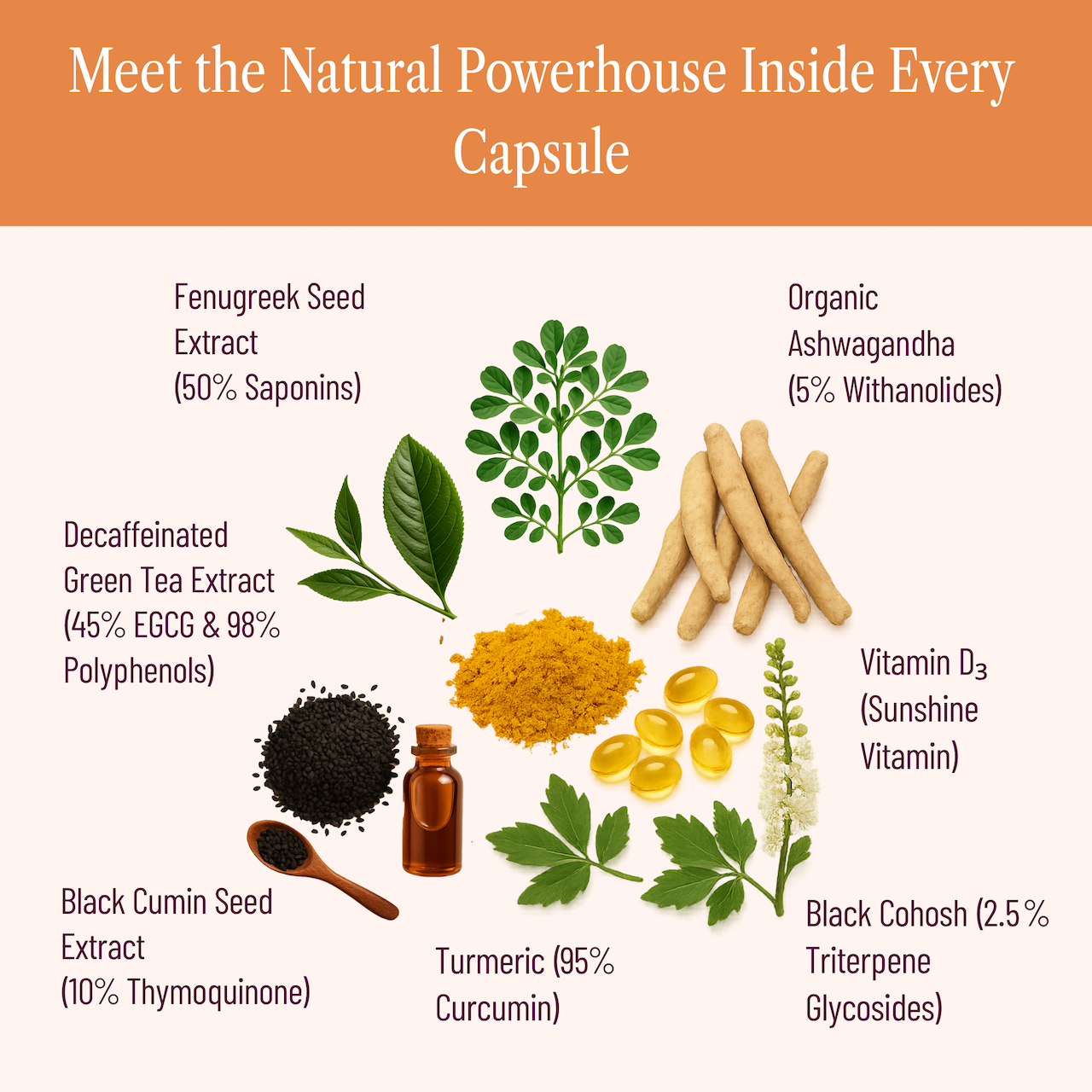 - Powered by turmeric, green tea, cumin seed, fenugreek, and ashwagandha.