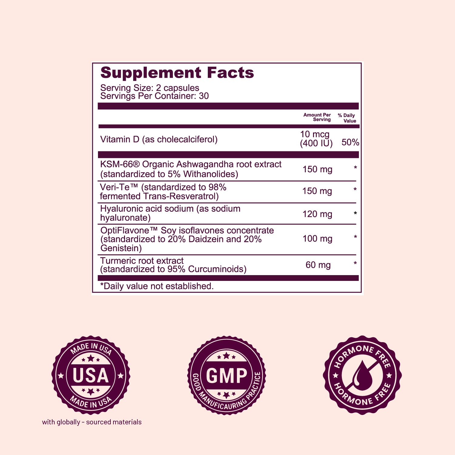 - Powered by resveratrol, vitamin D3, hyaluronic acid, turmeric, and soy isoflavones.