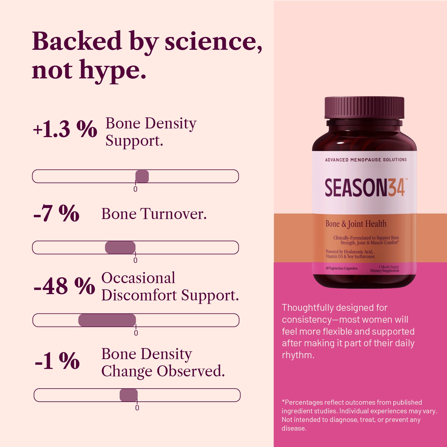 Clinically formulated to support strength, flexibility, and daily mobility through menopause. This blend combines resveratrol, hyaluronic acid, turmeric, soy isoflavones, and vitamin D₃ to promote comfort and ease of movement—helping you stay strong and active at every stage.