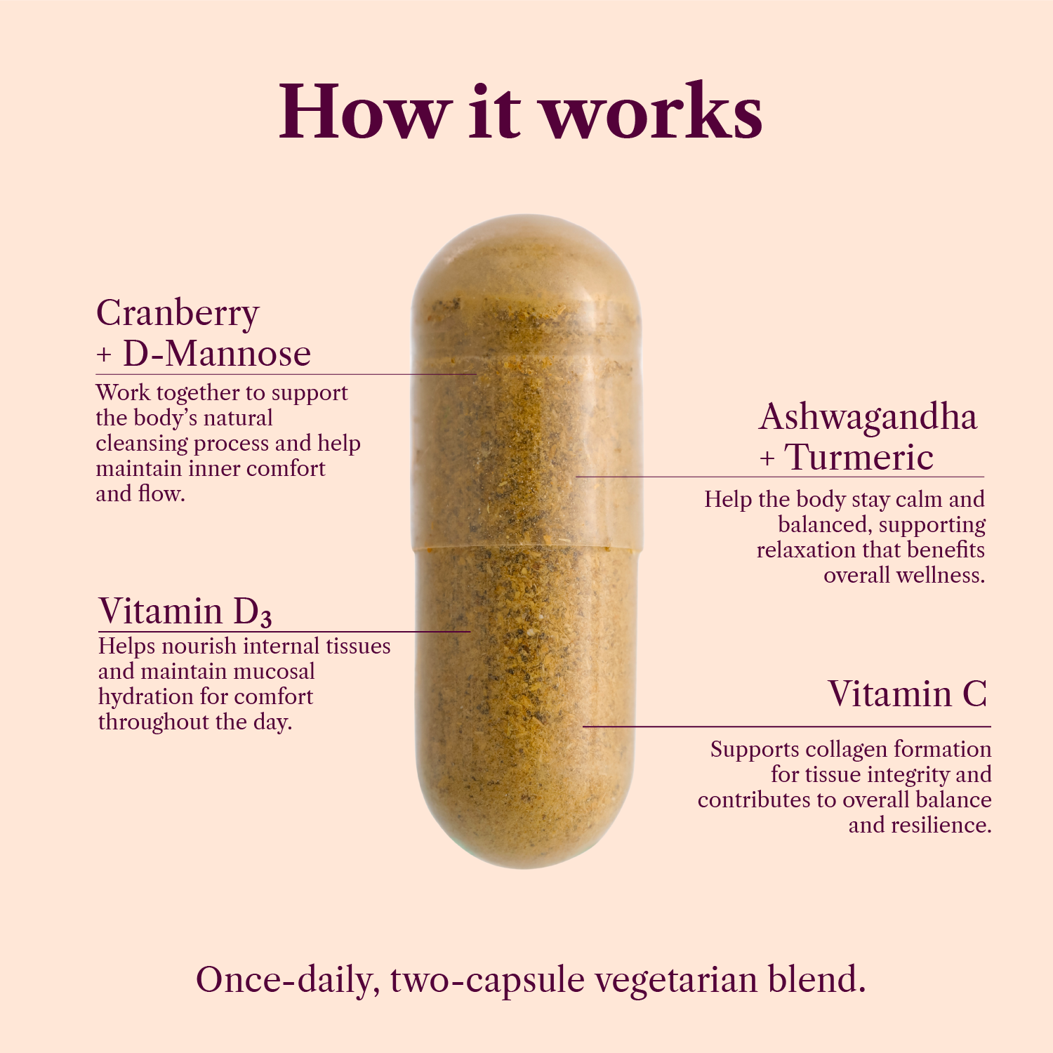 - Helps maintain internal freshness and comfort through the body’s natural filtration and microbiome processes.Powered by D-Mannose, Cranberry PACs, Vitamin C and targeted herbal extracts.